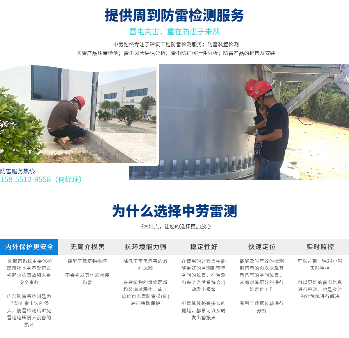 安徽中勞雷測(cè)檢測(cè)技術(shù)有限公司是一家主要從事防雷裝置檢測(cè)、防雷工程施工、防雷產(chǎn)品銷售及安裝,雷擊風(fēng)險(xiǎn)評(píng)估等工作的公司。 為提供周到的技術(shù)服務(wù),公司先后置辦了200多平方米的辦公場(chǎng)所;配備了防雷接地電阻測(cè)試儀、防雷元件測(cè)試儀、土壤電阻率測(cè)試儀、環(huán)路電阻測(cè)試儀等一批國(guó)內(nèi)外先進(jìn)的檢測(cè)設(shè)備。 公司營(yíng)業(yè)范圍:建筑工程防雷檢測(cè)服務(wù);防雷裝置檢測(cè);防雷產(chǎn)品質(zhì)量檢測(cè);雷擊風(fēng)險(xiǎn)評(píng)估分析;雷電防護(hù)可行性分析;防雷產(chǎn)品的...